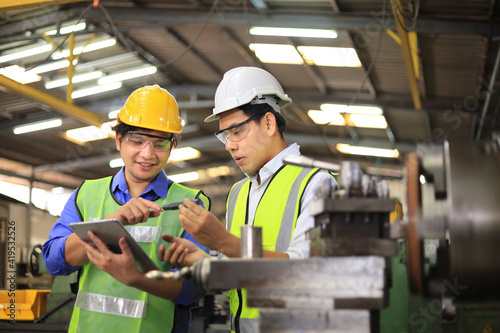 Asian engineering manager and mechanic worker in safety hard hat and reflective cloth using lathe machine inside the factory