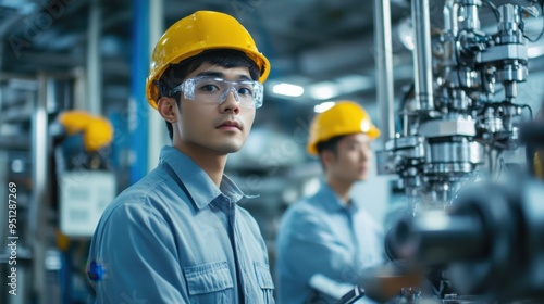 Asian engineers in a high-tech manufacturing facility, focused on advanced machinery and intricate designs, teamwork and concentration