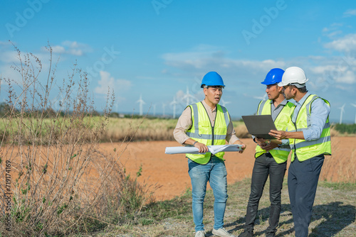 Asian engineers working in fieldwork outdoor. Workers walking and inspect construction and machine around project site. Wind turbine electrical of clean resource enerdy and environment sustainable.