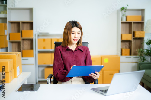 Asian entrepreneur woman using clipboard in home office. Surrounded by boxes, laptop & tablet. ecommerce, SME, delivery and startup business themes.