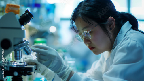Asian female scientist with glasses and white gloves conducting research in a laboratory with a microscope. Discoveries in science and technology through research and development.