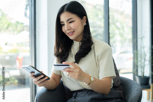 Asian girl shopping online holding credit and using smartphone enter their card number in the mobile phone app to purchase and payment in internet store