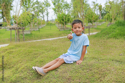 Asian little boy child showing thumb up and looking camera while sitting on green grass in the garden.