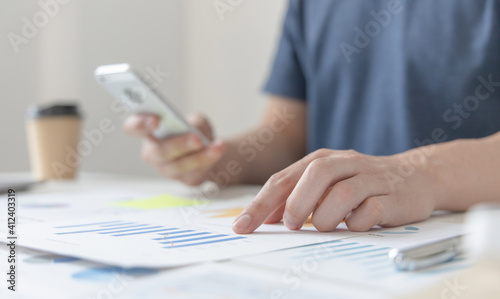 Asian male employees are analyzing market data via smartphones and have Calculator to calculate the company's finances In a private office at home, Working at home and new normal concept.