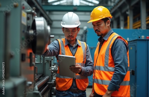 Asian male engineer and mechanic discuss work, using tablet near metal lathe machine. Workers wear safety hard hats, reflective vests. Factory environment, manufacturing process, quality control.