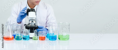 Asian male student scientist Wearing a doctor's gown in the lab looking at the chemist. caused by mixing reagents in scientific research laboratories with test tubes and microscope on the table