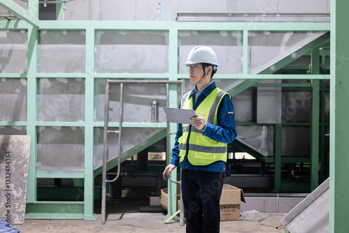 Asian male workers are working with digital tablet in the electroplating workshop.