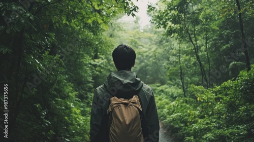 Asian man walking through a quiet forest, contemplating his journey while taking in the beauty of nature.