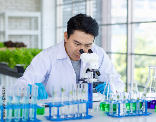 Asian professional male scientist researcher in white lab coat and rubber gloves sitting using microscope inspecting quality of vegetable in laboratory
