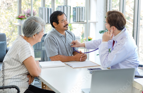 Asian professional successful male doctor in white lab coat with stethoscope hold medicine pill bottle showing explaining dosage and usage to elderly old senior patient and cousin in hospital office