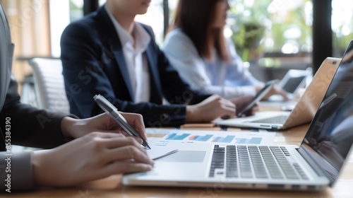 Asian project manager uses laptop displayed data analysis while professional business team brainstorming marketing idea at business meeting Working togethersharing idea planing strateg : Generative AI