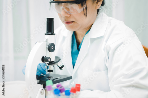 Asian scientist biochemist working research with a microscope in laboratory. For protect outbreak Coronavirus Covid19, bacteria and germs.