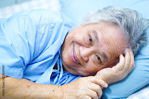 Asian senior or elderly old lady woman patient smile bright face with strong health while lying on bed in nursing hospital ward : healthy strong medical concept