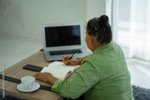 Asian senior retired business woman working at home with Laptop computer in new normal