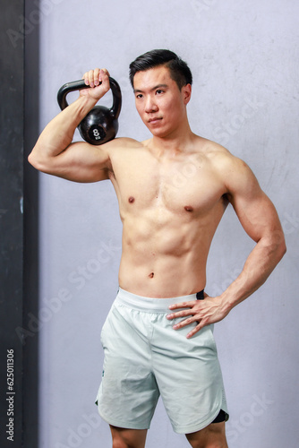 Asian strong handsome young male muscular shirtless fitness model in sporty shorts standing smiling holding lifting metal kettlebell dumbbell showing biceps triceps muscle in gym on gray background