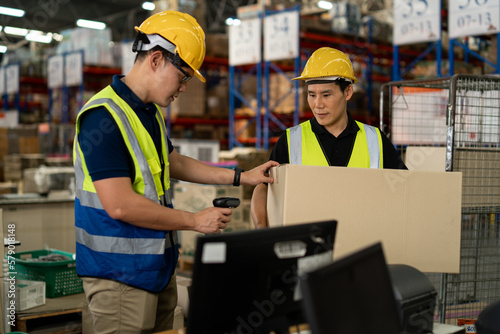 Asian warehouse workers team Checks Stock and Inventory on Desktop Computer in retail warehouse full of shelves with goods. teamwork at warehouse storage department.