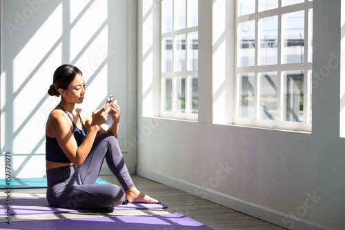 Asian woman in workout clothes is sitting on a yoga mat and using her smartphone, possibly checking messages or browsing social media. A lifestyle, relaxation after exercise and digital connectivity