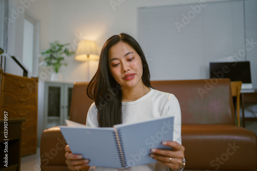 Asian woman reading notes from a notebook sitting on the floor in her living room, studying or working from home