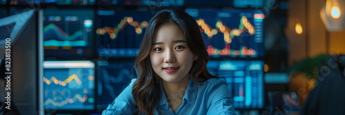 Asian woman smiling confidently at table with computer screen showing stock market charts and graphs.