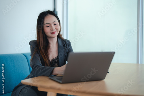 Asian young beautiful happy professional successful businesswoman designer sitting smiling at workstation desk using laptop notebook computer and smartphone working remotely online at home office