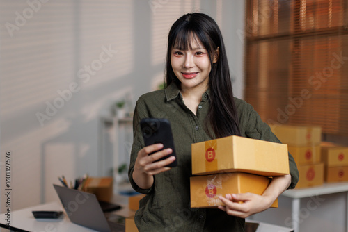 Asian Young Female entrepreneur using mobile phone and preparing orders for shipping in a warehouse.online marketing packaging box and delivery SME concept.