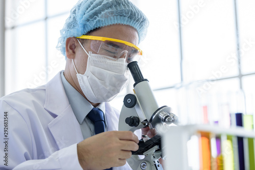 Asian young man student scientist researching and learning in a laboratory.