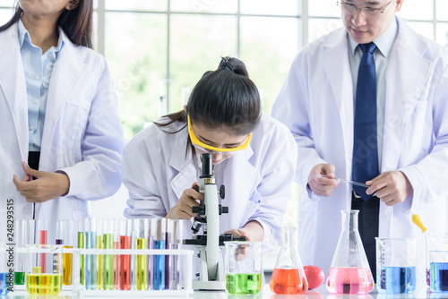 Asian young student scientist researching and learning with senior scientist have teaching in a laboratory.