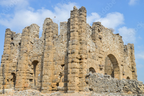 Aspendos was an ancient Greco-Roman city in Antalya. Famous historical landmark of Turkey. Founded in the 5th century BC. Great Basilica. Temple, Cisterns, City Square, Nymphaeum, Agora, Market hall.