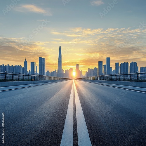 Asphalt highway road and bridge with modern city buildings scenery at sunset in Shenzhen, China. Urban road background.