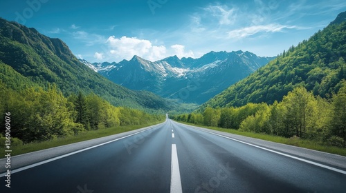 Asphalt highway road and green forest with mountain natural landscape under blue sky : Generative AI.