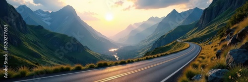 Asphalt ribbon winds through towering peaks, sunlit valley , high altitude, cliffs, shadows