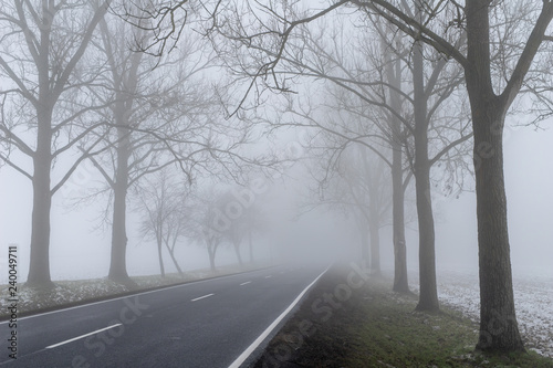 Asphalt road in the fog. A route connecting towns in central Europe.