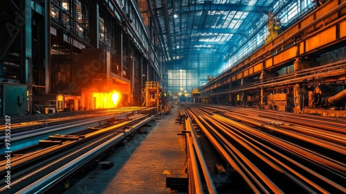 Assembly of long steel frames in production plant workshop for large metal construction. Industrial complex focusing on building robust steel structures, heavy-duty framework in manufacturing facility