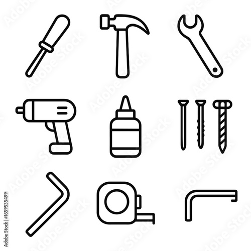 Assembly Tools Icons. Outline icon set of furniture assembly tools: screwdriver, hammer, wrench, drill, glue, nails, screws, Allen