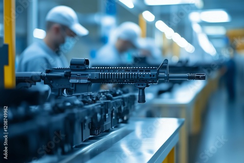 Assembly-line workers carefully inspect firearms during the production process in a manufacturing facility, ensuring quality and safety standards are met