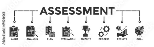 Assessment banner web icon for accreditation and evaluation method on business and education with audit, analysis, plan, evaluation, quality,process,results and goal icon