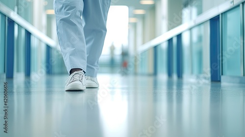 Assistant legs walking in hospital, Selective focus at the leg and blurred background with copy space in modern hospital. epoxy floor. Generative AI