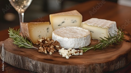 Assorted cheeses and walnuts arranged on a wooden board