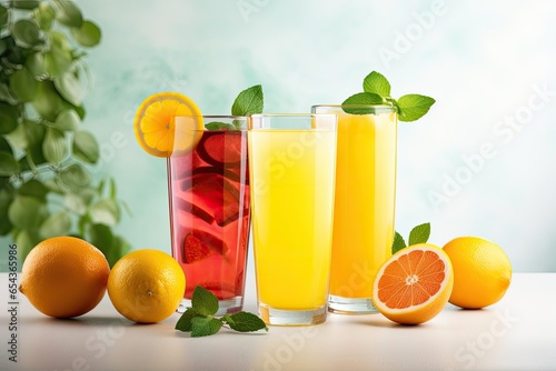 Assorted citrus juices in glasses on white backdrop Revitalizing lemonade Morning drink