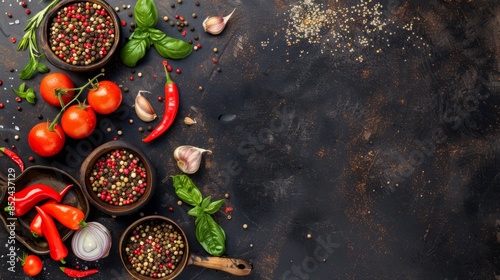 Assorted fresh vegetables and spices on dark rustic background