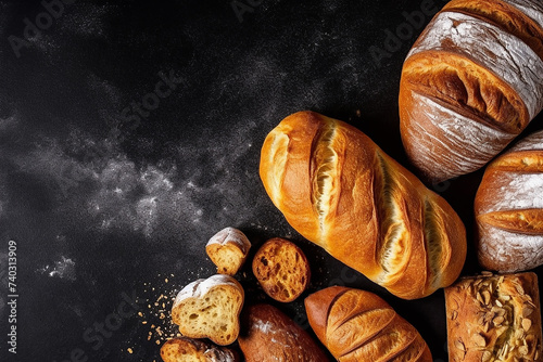Assorted freshly baked breads displayed on a dark surface with scattered flour.