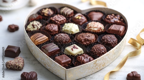 Assorted gourmet chocolates in heart-shaped box with ribbons