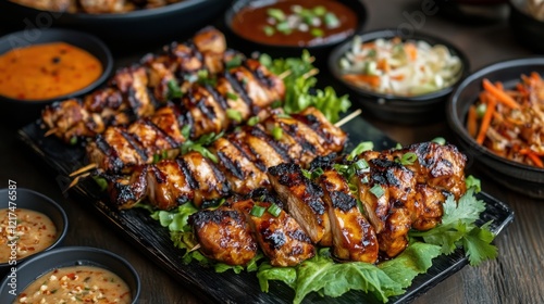 Assorted grilled chicken skewers served with sauces and fresh vegetables