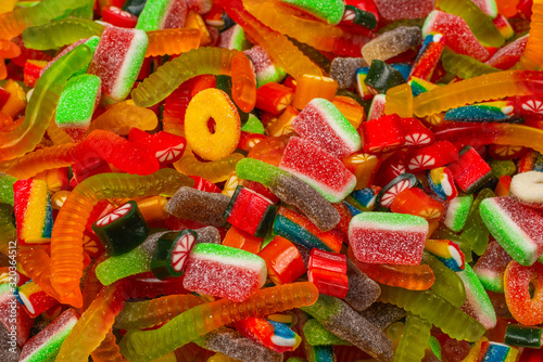 Assorted gummy candies. Top view. Jelly sweets background.
