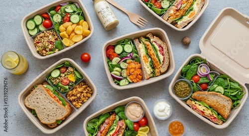 Assorted healthy lunch boxes with sandwiches, salads, and sides on a gray surface