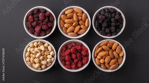 Assorted Healthy Nuts and Dried Fruits in White Bowls on Black Table Surface