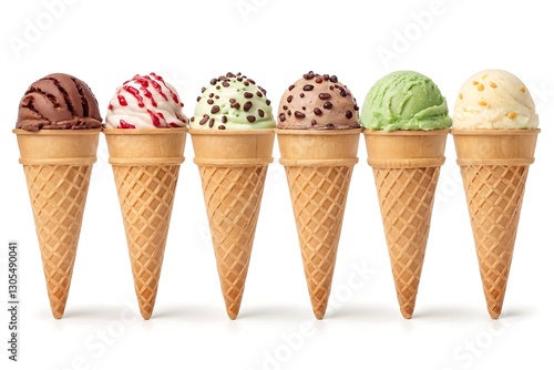 Assorted ice cream cones with chocolate, vanilla, and colorful sprinkle toppings, isolated on white backgroud