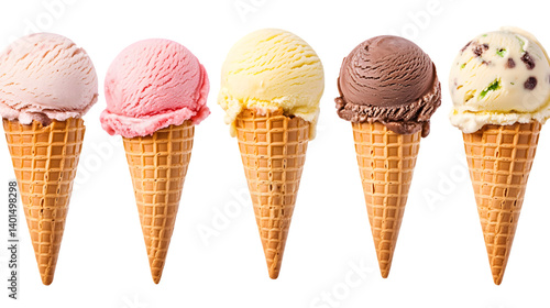 Assorted Ice Cream Scoops in Waffle Cones on White Background for Design Projects