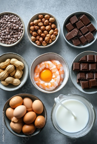 Assorted Ingredients for Baking and Cooking with Eggs, Shrimps, Chocolates, Nuts, and Milk on Gray Background
