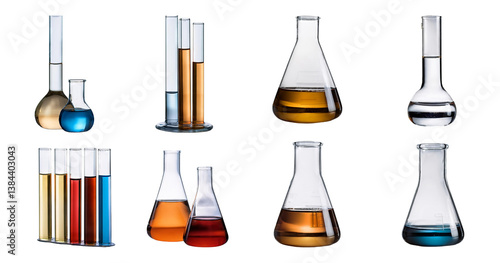 Assorted Laboratory Glassware with Colorful Liquids and Solutions, isolated on transparent background
